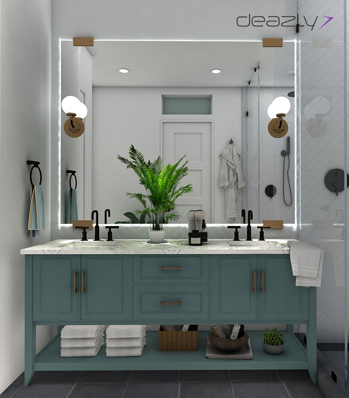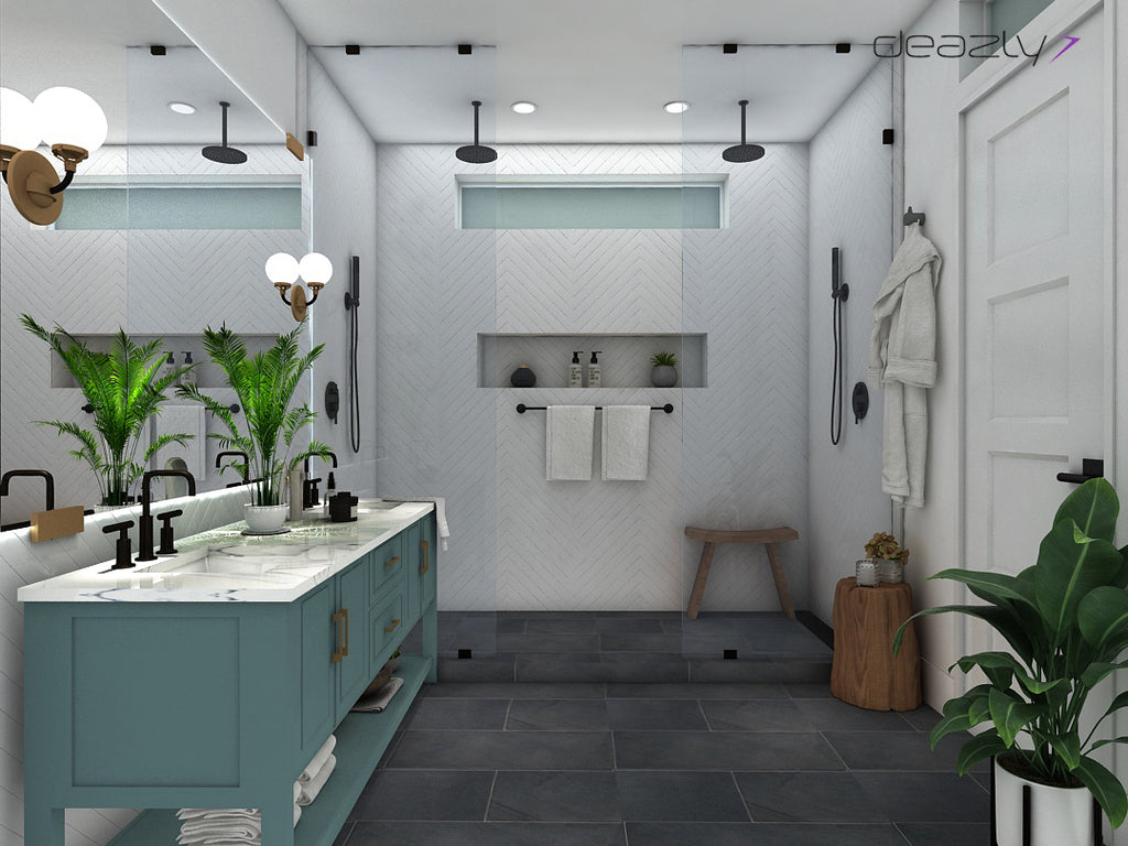 The 12” x 24” matte porcelain floor tile gives an organic feel to this bathroom. The look of stone provides a more calming aesthetic c to the otherwise contemporary bathroom with its blue vanity, polished white ceramic tile, and back-lit mirror.