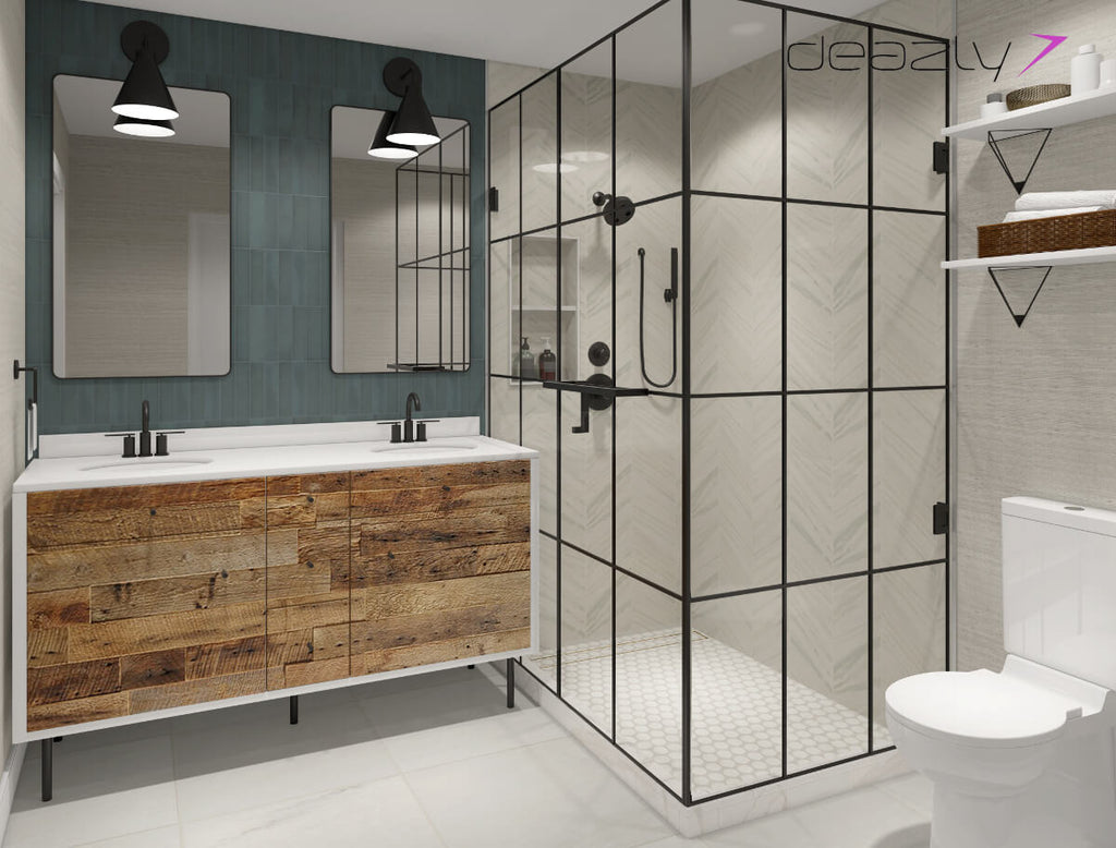 Reflecting A Tailored Approach To A Mid-Century Style, This This Design Focuses On Providing A More Refined Sense Of Space By Introducing Modern Streamlined Finishes And Furniture Selections Paired With Warmer Cream, Grey And Beige Tones, A Reclaimed Wood Vanity With A Lacquered Surround, A Deep Indigo Blue Accent Tile Paired With Matte Black Metal Finishes.