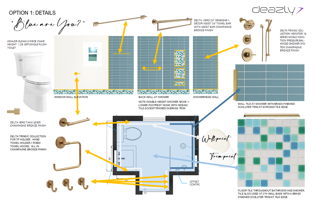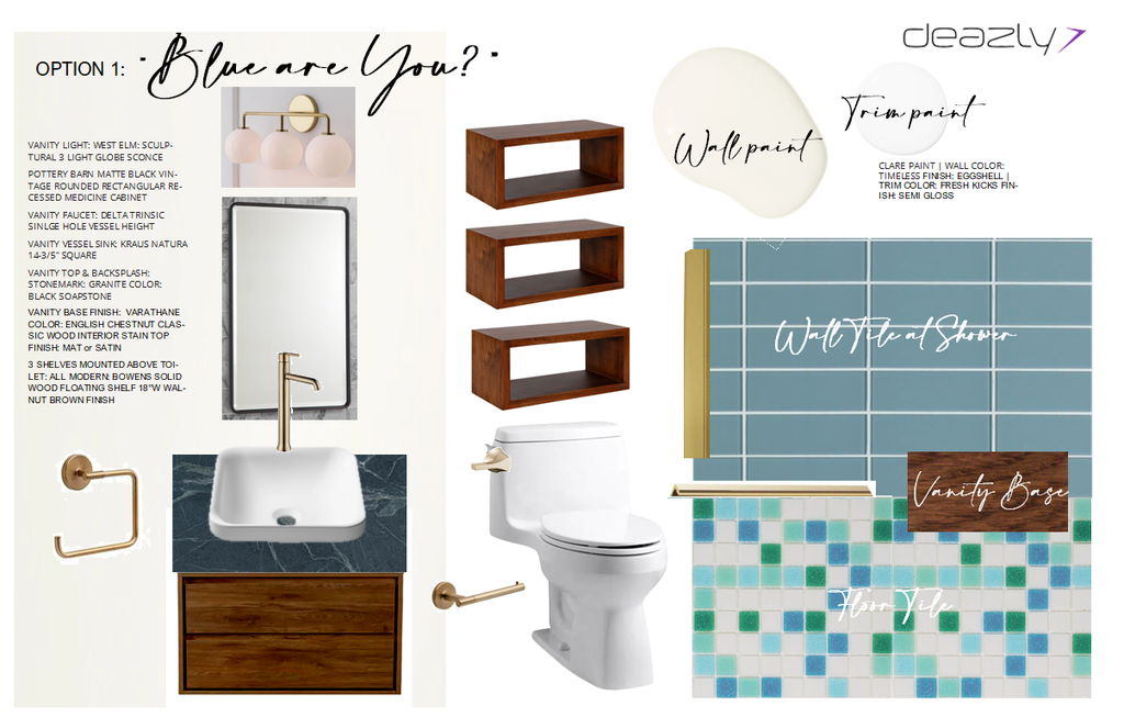 Blue is the star of the show in this scheme, the glass wall tile at the shower makes for a very clean and sleek look – the greens in the floor tile help keep the color scheme varied and unique. Wood and Brass accents add warmth throughout.