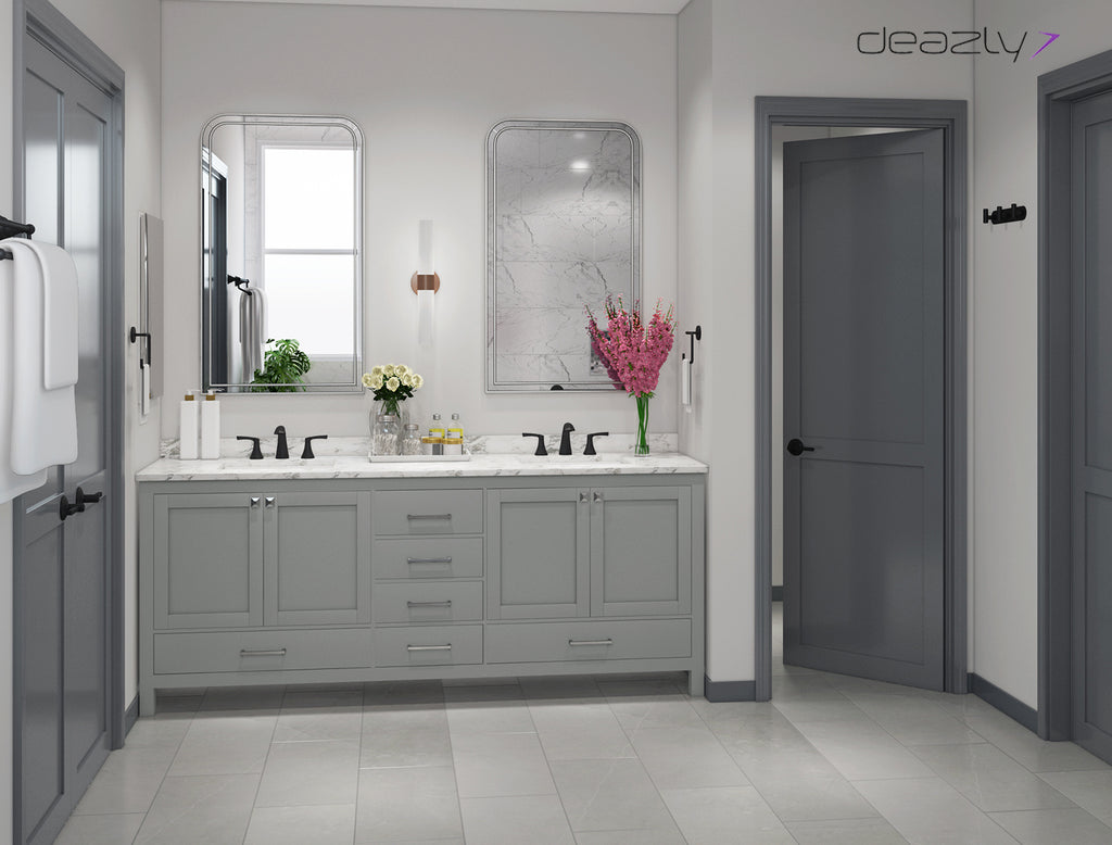 Elegant and bold, this concept is a perfect balance of traditional and modern styles. The soap Stone look porcelain tiles create a fresh feel for the room and is maintenance free. The neutral Grays in the vanity, paint and shower tile are paired with contrasting black hardware/furniture giving it an assertive & contemporary feel.