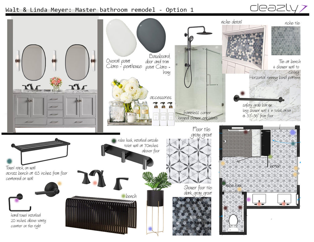 Elegant and bold, this concept is a perfect balance of traditional and modern styles. The porcelain floor tiles with its monochromatic smooth curves and hexagon format take center stage in creating a vibrant and sophisticated bathroom. The neutral grays in the vanity, paint and shower tile are paired with contrasting black hardware/furniture giving it an assertive & contemporary feel.