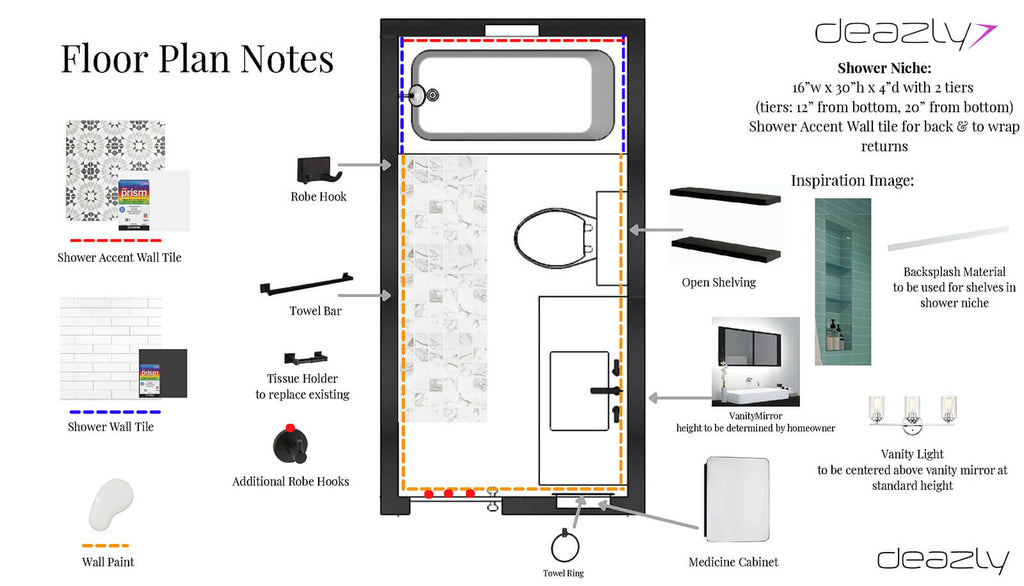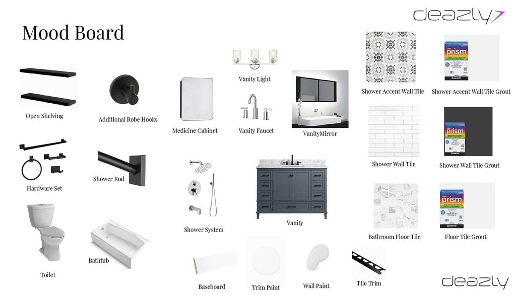 This design features cool hues and calm tones, both in the gray of the walls and in the deep steel blue of the vanity. With black and chrome finishes and a vibrant accent shower wall, this space provides a fun atmosphere to refresh each day.