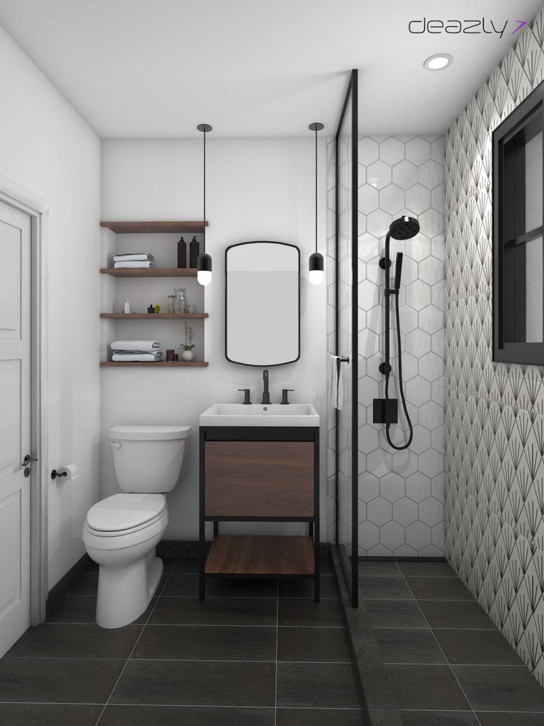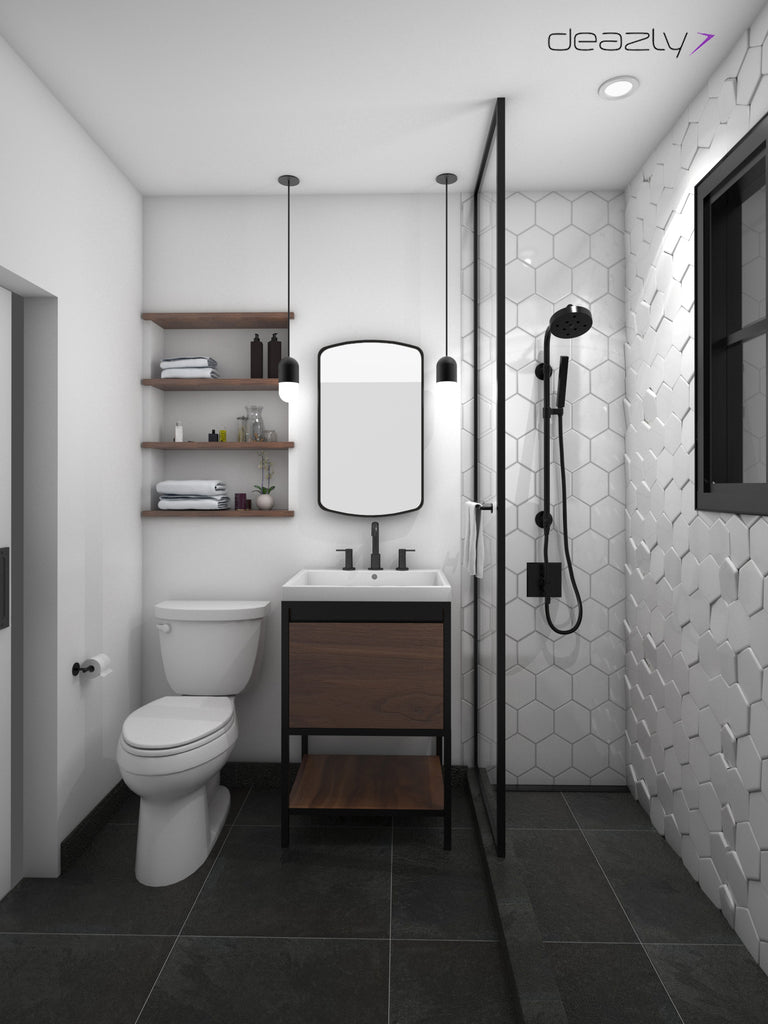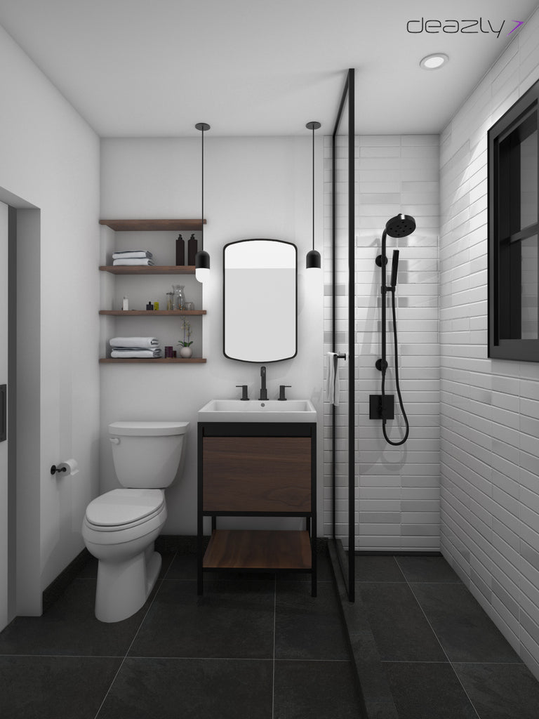 The black and white palette is paired with the warmth of the wood tones to create a “spa-like” feeling in this urban design concept.