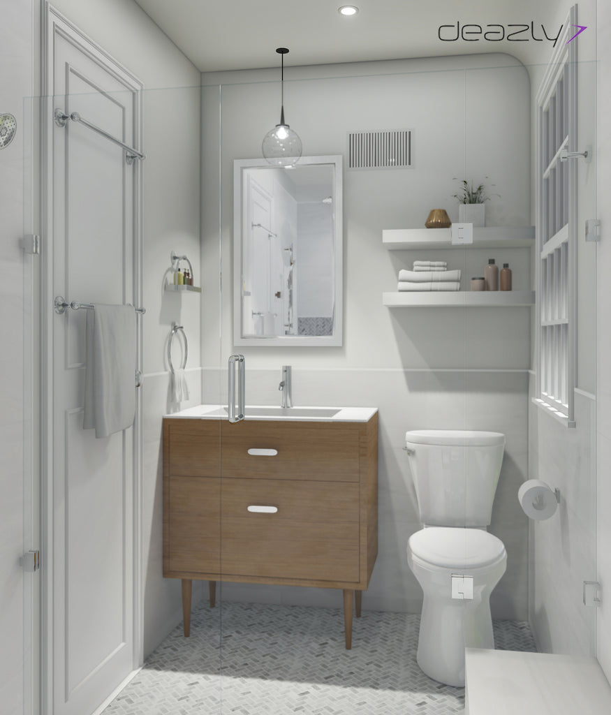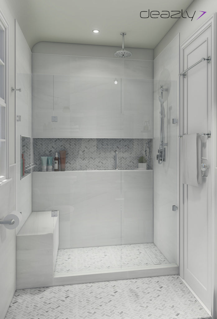 The mix of wood and marble looking tiles create a clean and bright bathroom adding a touch of shabby elegance. While the marble chevron tiles bring elegance to the setting, the wood vanity adds a timeless appeal creating a spa inspired bathroom. The design carves a place for peaceful recuperation in which you can fully relax under a steaming waterfall shower.