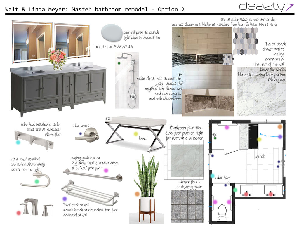 All the finishes in this concept have been carefully selected to create a feeling of serenity and Coolness. Brushed nickel hardware & accessories, gray tones and the white marble shower tiles Attribute to this feeling. The overall neutral palette is accented with a mixed finish blue and Gray mosaic tile in the shower and an airy blue paint. Large led mirrors provide plenty of light While highlighting the tall ceilings in the room