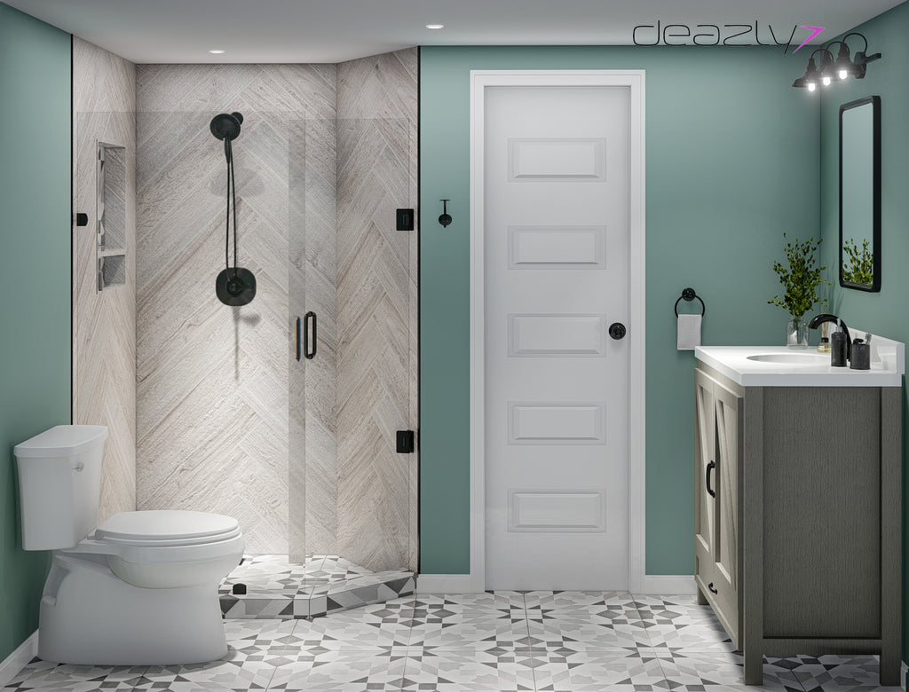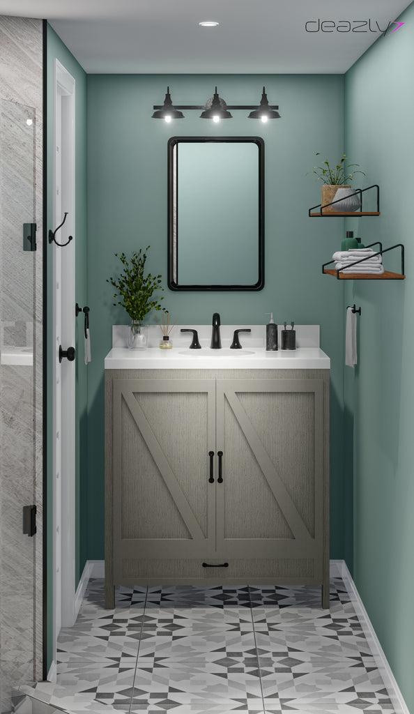 The grey patchwork patterned floor tile draws your eye in and around the room. The white ship lap walls offer texture and brighten the room for a clean look. Paint above the ship lap offers color while the aged bronze hardware offers a nice contrast to the bright room.