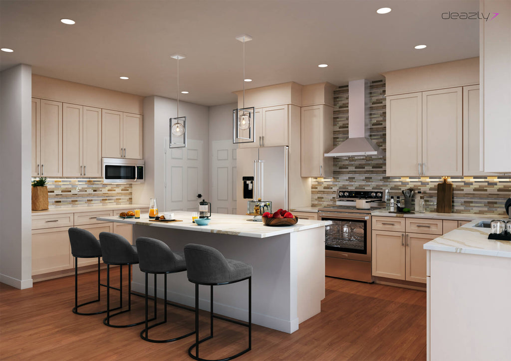 The large island in the middle is highlighted with a beautiful Calacata leon gold quartz countertop and contemporary yet classic brushed nickel pendant, making it a perfect gathering spot for family and friends.