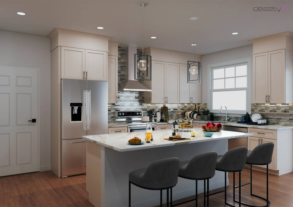 Light and bright, this kitchen redesign features transitional style with elegant finishes - all of these work well with the existing wood flooring that will flow into the kitchen area. The off white Linen cabinets offer plenty of storage and visually open up the space.