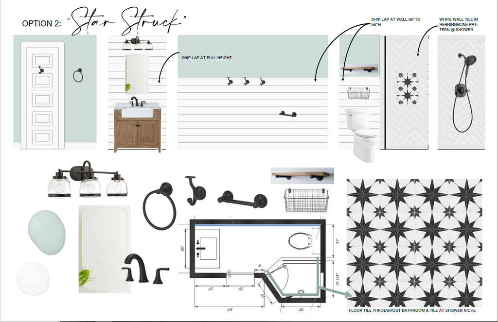 For an all around brighter look white herringbone tile is used at the shower walls which transition into white ship lap walls for a rich texture and a light and airy color scheme. The bronze accents and black and white floor tile add contrast and interest drawing the eye around the room to the utilitarian accessories.