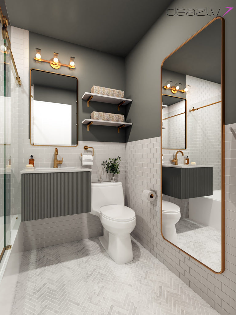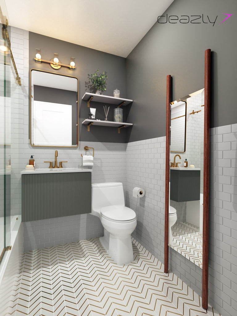 This two-tone design uplifts the current bathroom space, teetering between both classic and modern styles. The exist-ing subway tiles, paired with carrara marble herringbone flooring and gold accents lend towards to classic aesthetic, while the simplified painted wood vanity and showstopper vanity light, add a level of modernism. The wall-mounted vanity provides both style and function, with a single, deep drawer that offers concealed storage. Additional items can be stored behind the vanity mirror/ medicine cabinet or within the baskets on the decorative shelves above the toilet. All 5 walls (the 4 walls + the ceiling) are painted in a medium tone gray to match the vanity cabinet. Although this space has minimal square footage, the floor-length mirror and glass enclosure at the tub/ shower opens up the space making it appear larger than it is!