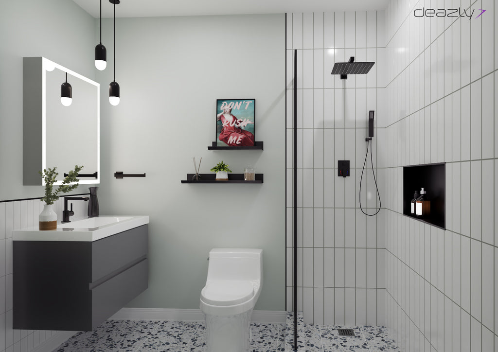 This bathroom features a modern display of materials and textures. The vanity wall tiled with the herringbone pattern provides a focal point in the room. Plenty of storage is offered within the spacious vanity, the functional circular mirror with a recessed cabinet behind, the second medicine cabinet (not shown in view), and the bold concrete shelves on the wall. The gray slate flooring complements the sleek design scheme. The warm wood tones in the vanity balance out the monochromatic tones in the rest of the space.