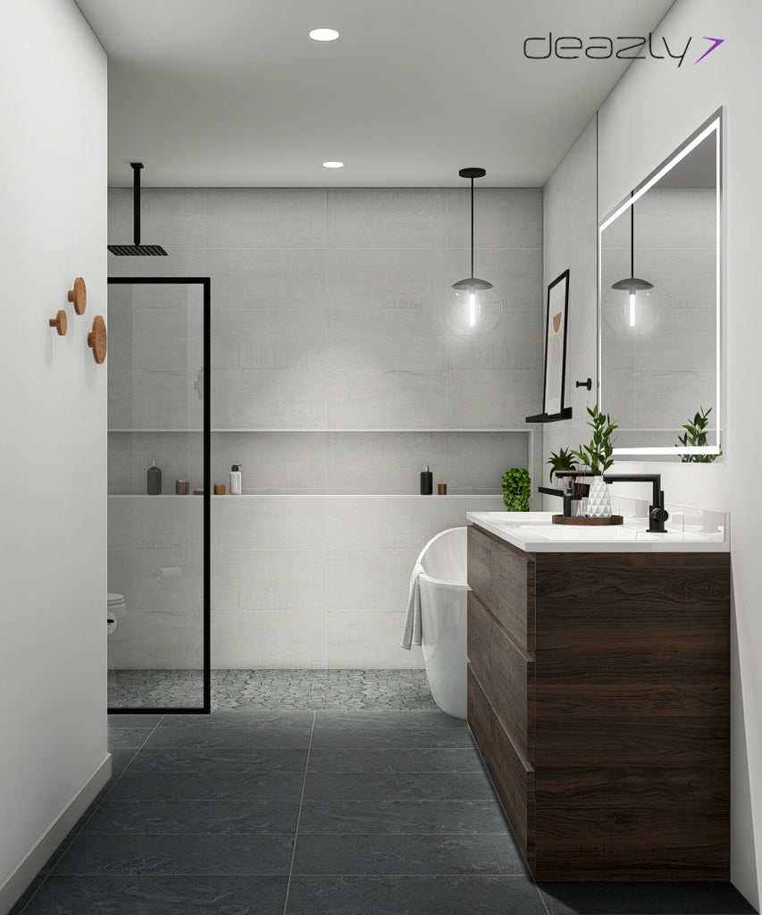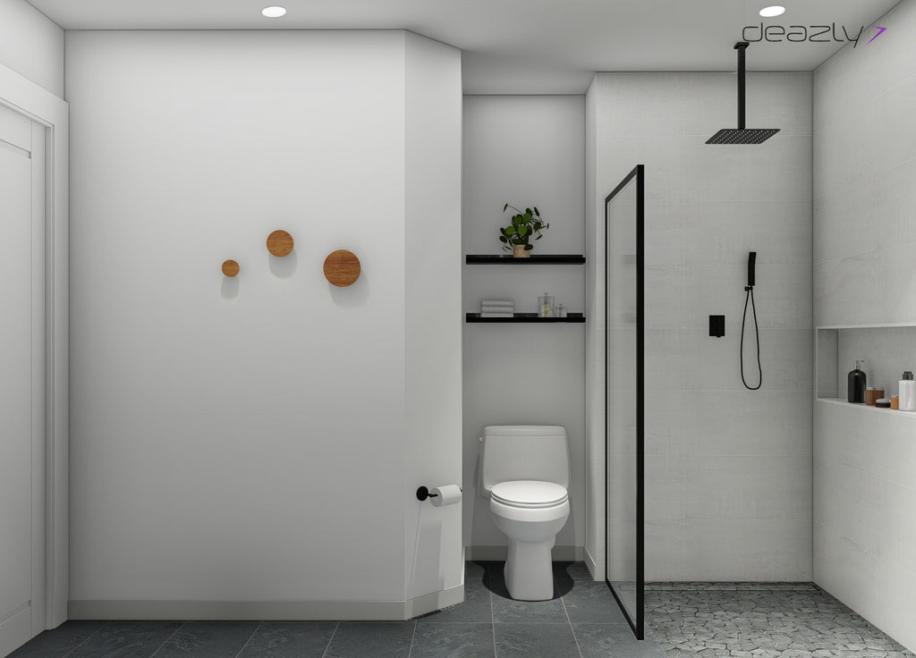 This option has light natural finishes throughout and is meant to offer a visually relaxing space to clean up and destress. It’s minimal and clean with each item serving a functional and stylish purpose. Warm tones are brought in by the spacious wood vanity and the sculptural robe hooks on the wall. The matte black finish on all the fixtures and accessories offers a contrasting bold punch to the cool space. The shower niche, recessed medicine cabinet, and shelf above the soaking tub all offer additional storage which is always needed.